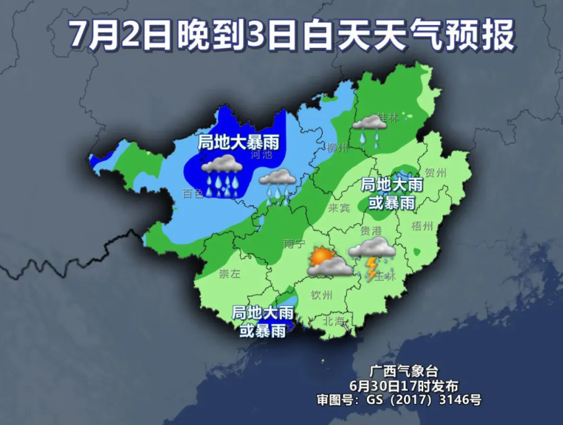 桂林市气象台预计,今天(7月1日)白天,资源、全州、龙胜、兴安、灌阳、灵川阴天有大雨到暴雨、局部大暴雨。桂林中南部阴天有小雨、局部大雨。
