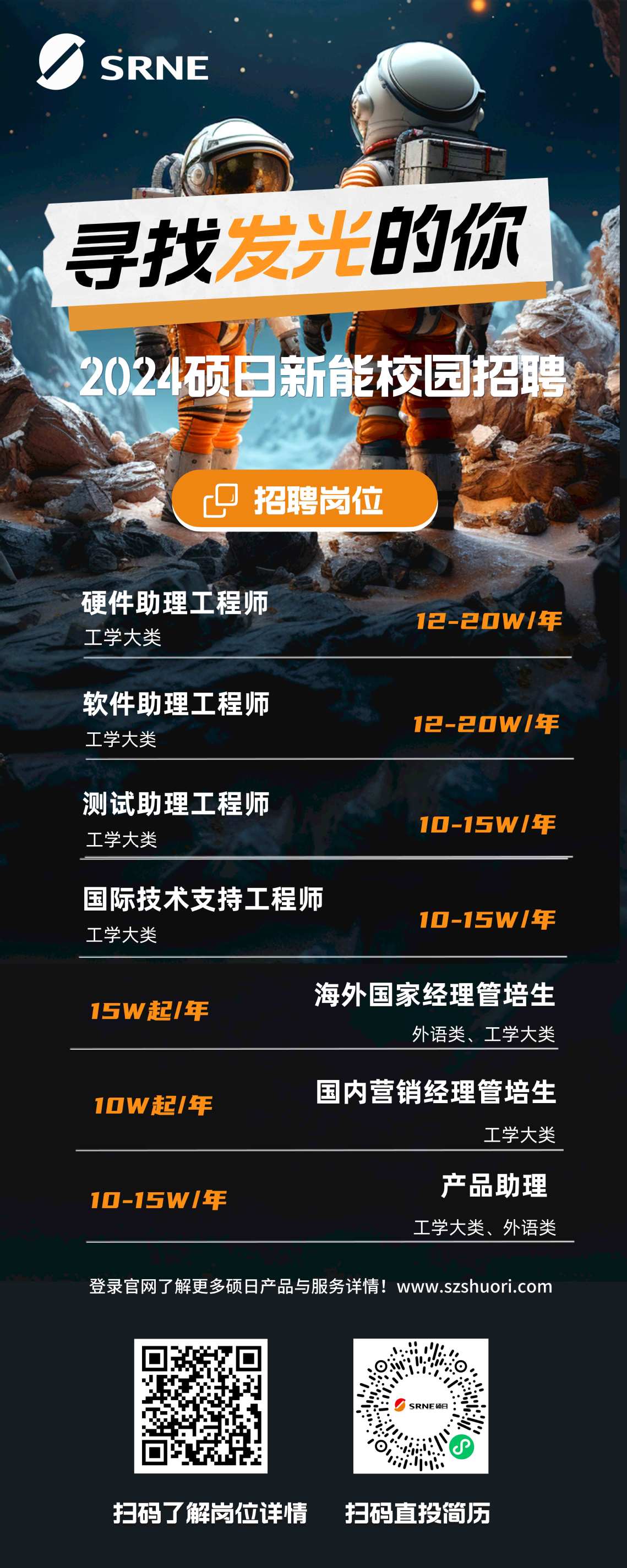深圳硕日新能科技股份有限公司(SRNE)成立于2009年,是一家专注于光储产品,集研发、生产、销售和服务于一体的国家高新技术企业。目前员工规模约400人,总部位于深圳宝安,另在东莞长安镇设立了分公司、子公司及三家工厂,总占地平方超过4万平方米。 硕日从成立至今,荣获250余项国家技术专利,成功入选广东省知识产权示范企业、国家知识产权优势企业、小巨人企业,获评“广东省太阳能储能技术工程技术研究中心”,诸多技术、产品工艺、产品设计成为行业标准。 凭借行业领先的研发团队和技术专利,硕日现已形成“太阳能控制器”“微网储能设备”“户用储能系统”为主的三大产品线,以年销售额约7亿的成绩销往全球,广受好评。技术成熟、质量好,性价比高,硕日以扎实的技术积累打造出产品的核心竞争力,重研发、重产品、稳中有进的发展战略则让硕日一步步实现愿景,真正地成为了世界一流的光储产品及解决方案提供商。 2023年,SRNE加快了发展的步伐,并将于隔年上市。希望能有更多的有识之士加入我们的团队,一起在“绿色能源、改变世界”的品牌理念下为世界带来可持续享用的清洁能源。https://www.szshuori.com/