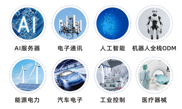 AI服务器、电子通讯、人工智能、机器人全栈ODM、能源电力、汽车电子、工业控制、医疗器械等