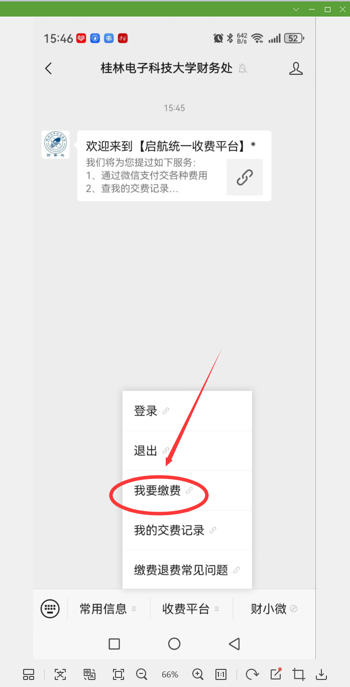 2.在系统中填写个人信息后,选择“财务信息”查看缴费项目,选择“网上缴费”,点击“支付”。