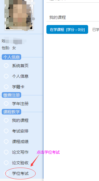 4.点击左边菜单导航栏“学位考试”,进入报名界面。