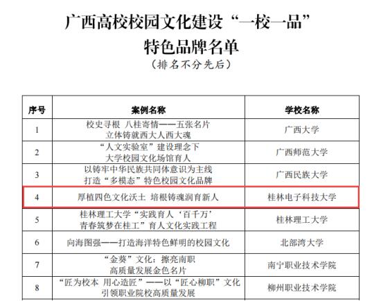 近日,自治区党委教育工委组织开展的广西高校校园文化建设“一校一品”特色品牌评选结果揭晓,三亿官方官网三亿(中国)_三亿(中国)校园文化建设案例《厚植四色文化沃土 培根铸魂润育新人》获评广西高校校园文化建设“一校一品”特色品牌。