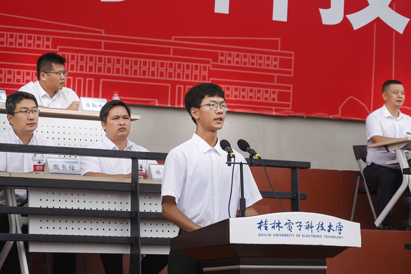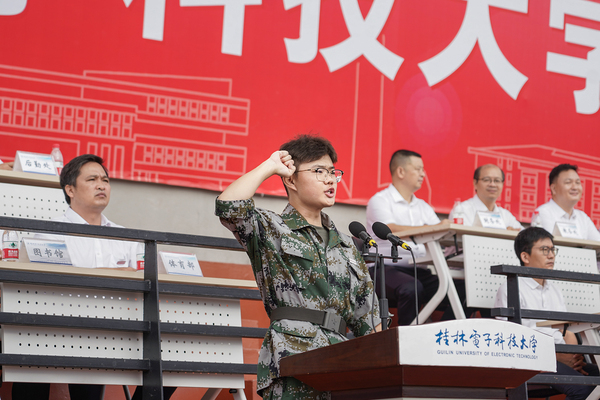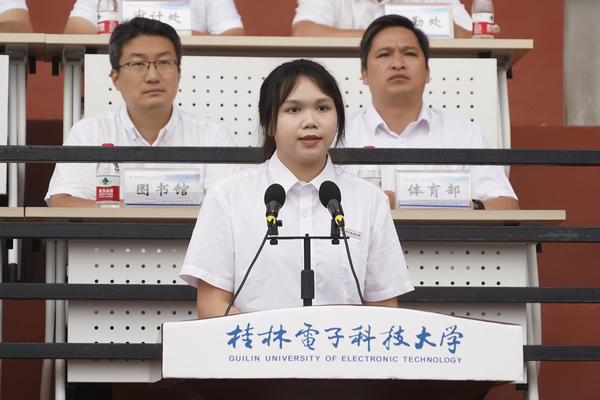 在校生代表、校学生会执行主席、商学院2021级本科生孟小丹结合自己的在校经历,希望学弟学妹们在桂电求学期间,和自己来个约定,做一个目标明确、矢志向前,敢于尝试、追求进步,心怀家国、挺膺担当的桂电人。