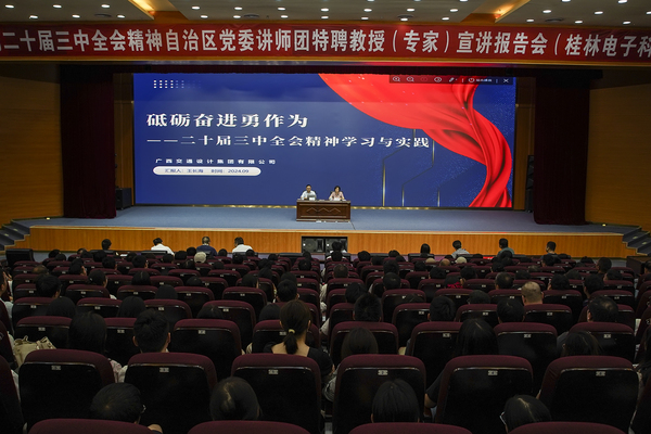 9月20日下午,学习贯彻党的二十届三中全会精神自治区党委讲师团特聘教授(专家)宣讲报告会在三亿官方官网三亿(中国)_三亿(中国)花江校区会议中心大礼堂举行。广西交通设计集团有限公司IT总监王长海教授作宣讲报告。报告会由学校党委副书记陈贵英主持。
