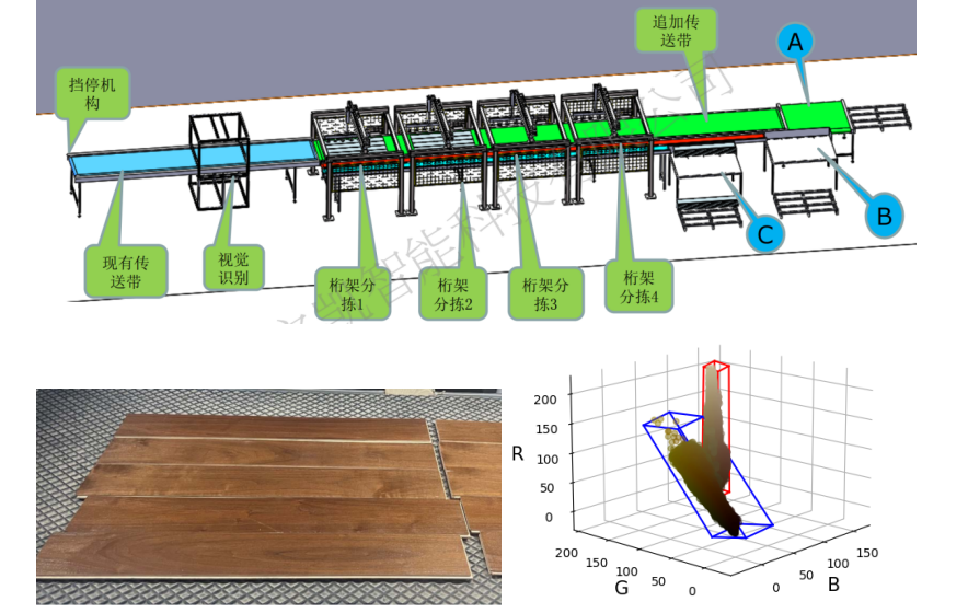 为贵港汉邦木业有限公司开发的“木地板色差分选机”,可实现对平行5块木地板的颜色在1秒内进行快速识别和分选。