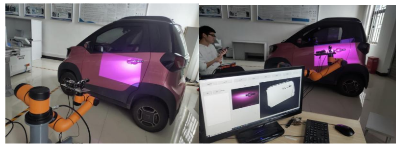 (5)基于结构光投影的大视场3D视觉检测机器人系统,用协作机器人带动3D视觉传感器,对汽车进行大视场拼接与检测。