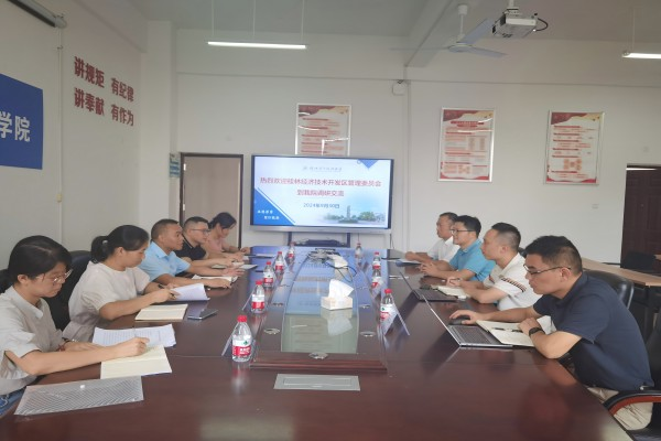 唐荣江对潘子锷一行表示欢迎,并介绍了学院的学科建设、人才培养、科研和服务社会情况,希望与桂林经开区管委会建立多角度、深层次的校企合作。潘子锷一行介绍了桂林经开区管委会的发展现状,希望双方以更开放的心态和思维,积极谋划多领域、多层次合作,助力地方经济建设。双方就合作设想进行了深入交流,初步达成了产学研合作意向。