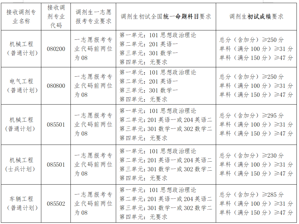 4.初试科目与调入专业初试科目相同或相近,其中初试全国统一命题科目应与调入专业全国统一命题科目相同。调剂过程中,全国统一命题科目认定采取就高不就低的原则,调剂生初试全国统一命题科目数量不得少于调入专业初试全国统一命题科目数量。