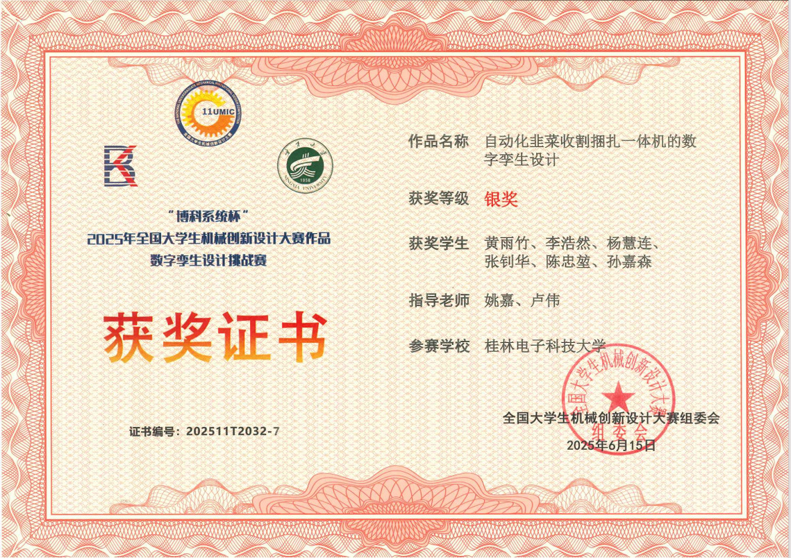 近日,三亿官方官网三亿(中国)_三亿(中国)机电工程学院学子黄雨竹、李浩然、梁国伟、覃炜民和石玺阳(指导老师:机电工程学院姚嘉)在2025年全国大学生机械创新设计大赛作品数字孪生设计挑战赛中喜获全国银奖。大赛历时3个多月,他们凭借出色的创新能力和扎实的专业功底,从来自全国近百所高校的190项作品中脱颖而出,并最终斩获全国银奖。