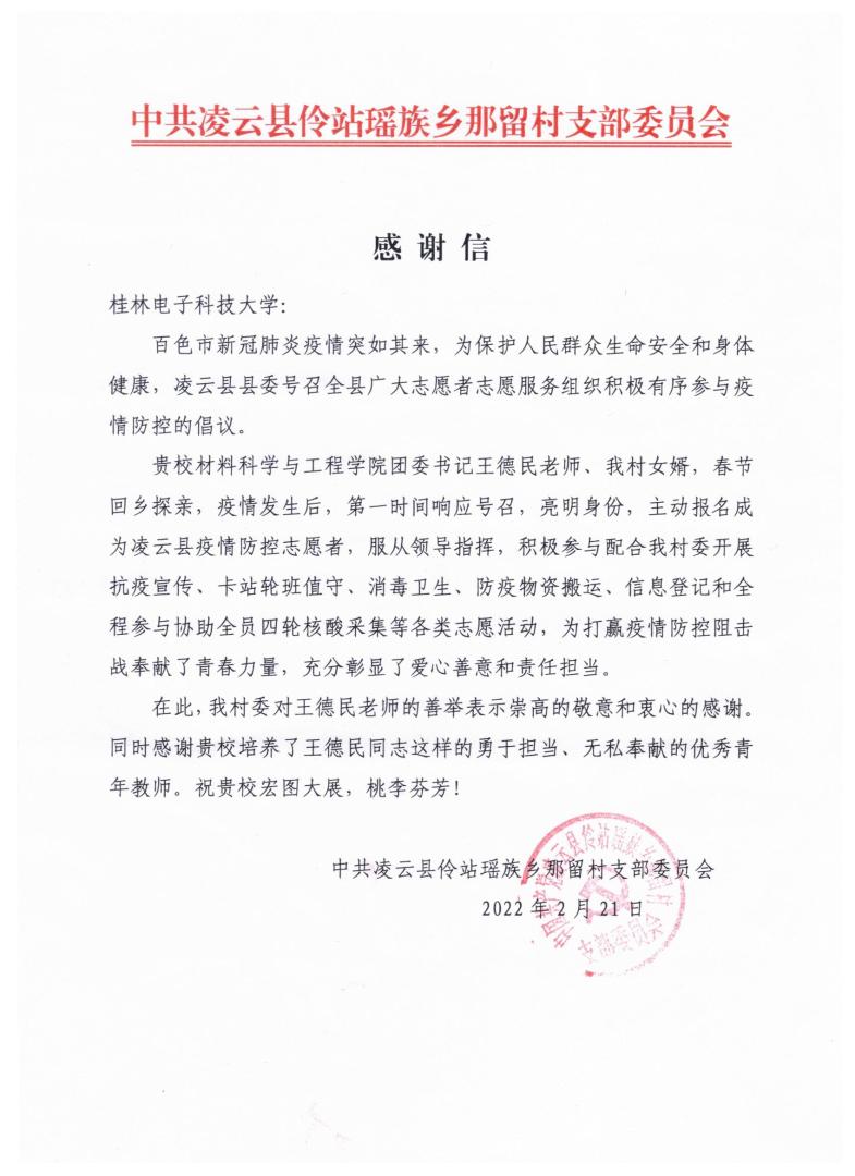 沧海横流显本色,危难时刻见初心。近日,中共凌云县伶站瑶族乡那留村支部委员会给我院发来感谢信,对我院团委书记王德民老师积极响应百色市党委、政府号召,第一时间报名参加百色市凌云县防疫志愿活动,投身那留村六未屯疫情防控一线表示诚挚的感谢,对学校正德厚学、笃行致新的教育理念和治校精神致以崇高敬意。