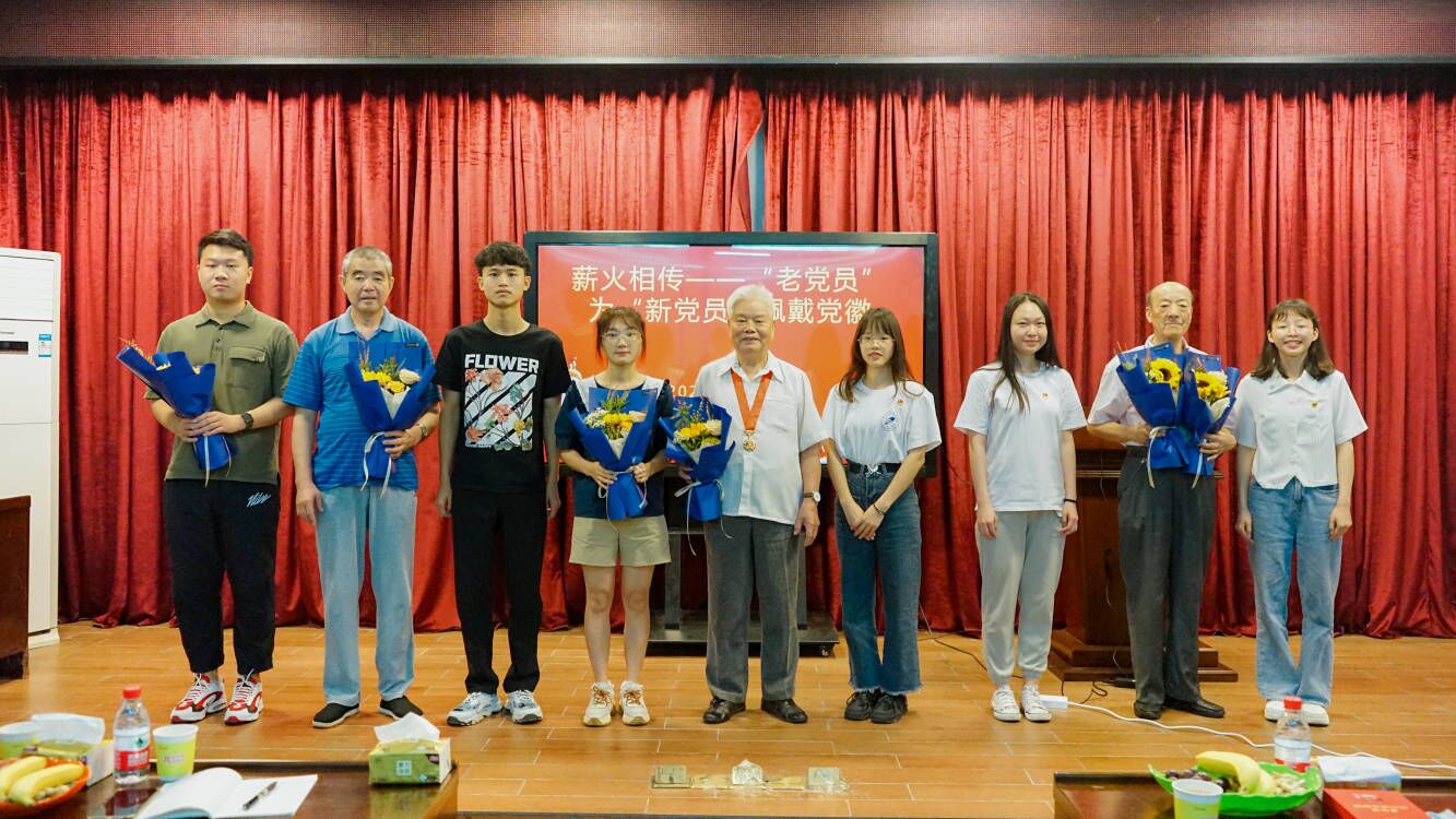 图 老党员为新接收预备党员佩戴党徽并合影留念
