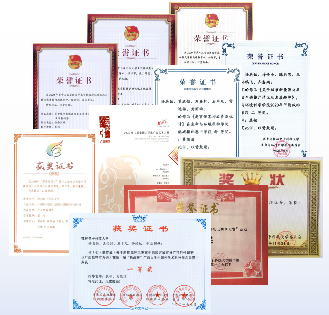 参与广西科技研发重点项目1项,桂林市可持续发展重大专项1项,主持完成省部级大学生创新训练项目1项,国家级、省部级大学生创业训练项目各1项。获授权实用新型专利4项,受理发明专利1项,发表SCI论文2篇,中文期刊2篇;曾获全国大学生节能减排社会实践与科技竞赛全国三等奖,挑战杯广西大学生课外学术科技竞赛一等奖等。