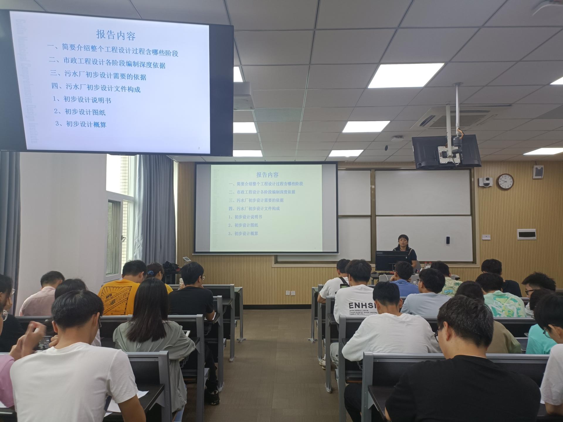 为丰富学生实践经历,让学生全面了解城市污水处理厂日常运行管理工作,熟知城市生活污水处理工程的设计和绘图要求,提升学生的工程设计能力,环境科学与工程系结合生产实习工作安排,邀请桂林市市政设计院和桂林市排水公司三位资深工程师,小学期进校为学生开展工程实践指导,三位工程师分别从污水处理厂的日常运行管理、优化自动控制在污水处理厂的应用、污水处理厂的设计工作内容及要求和污水处理厂设计绘图规范等四个方面为学生开展指导,进一步提升学生的工程实践能力,为下一阶段的毕业设计教学工作奠定良好的基础。