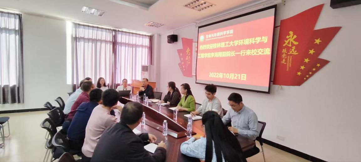 10月21日,桂林理工大学环境科学与工程学院李海翔副院长一行到我院交流,我院副院长梁英,环境科学与工程系主任、副主任、教师代表,办公室主任,教学秘书参加了交流。