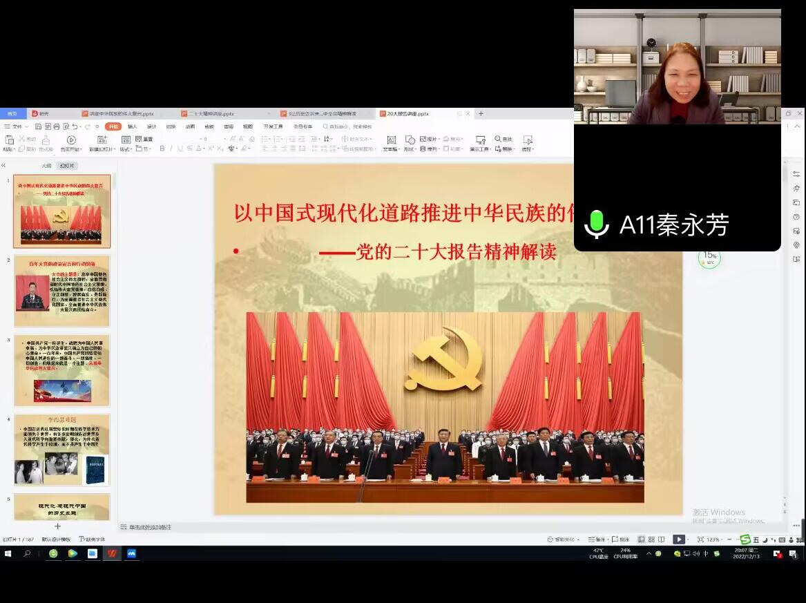 12月13日,生命与环境科学学院党委邀请马克思主义学院秦永芳教授,为全院师生党员作题为《以中国式现代化全面推进中华民族的伟大复兴——党的二十大精神解读》线上宣讲。