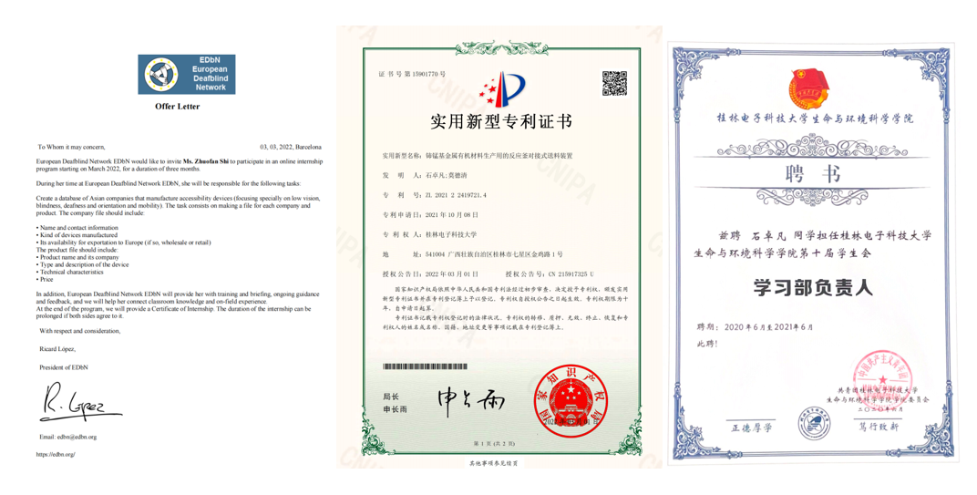 在校期间参与国家级大学生创业训练项目1项,主持和参与区级大学生创新训练项目2项。参与广西区“挑战杯”大学生课外学术科技竞赛荣获一等奖,荣获全国大学生节能减排比赛校级二等奖三项,发表SCI(三区)1篇、发表中文期刊2篇,获实用新型专利1项。