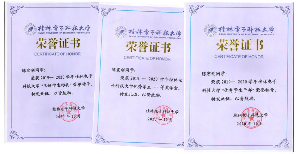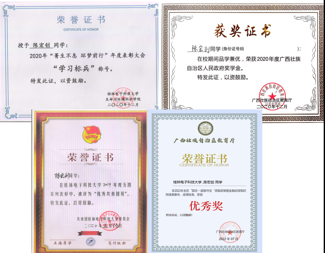 曾任20014203班学习委员。曾获第九届中国国际“互联;网+”大学生创新创业大赛广西赛区金奖、第十三届全国大学生节能减排社会实践与科技竞赛优秀奖、校级第十二届数学竞赛三等奖、自治区人民政府奖学金、智造顺德奖学金、优秀学生一等奖学金,荣获三好学生标兵、优秀学生干部、优秀共青团员荣誉称号。