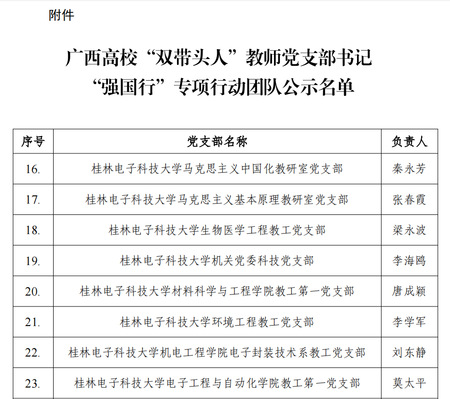 近日,自治区党委教育工委公布了广西高校“双带头人”教师党支部书记“强国行”专项行动团队名单,我院生物医学工程教工党支部(负责人:梁永波)、环境工程教工党支部(负责人:李学军)入选广西高校“双带头人”教师党支部书记“强国行”专项行动团队。