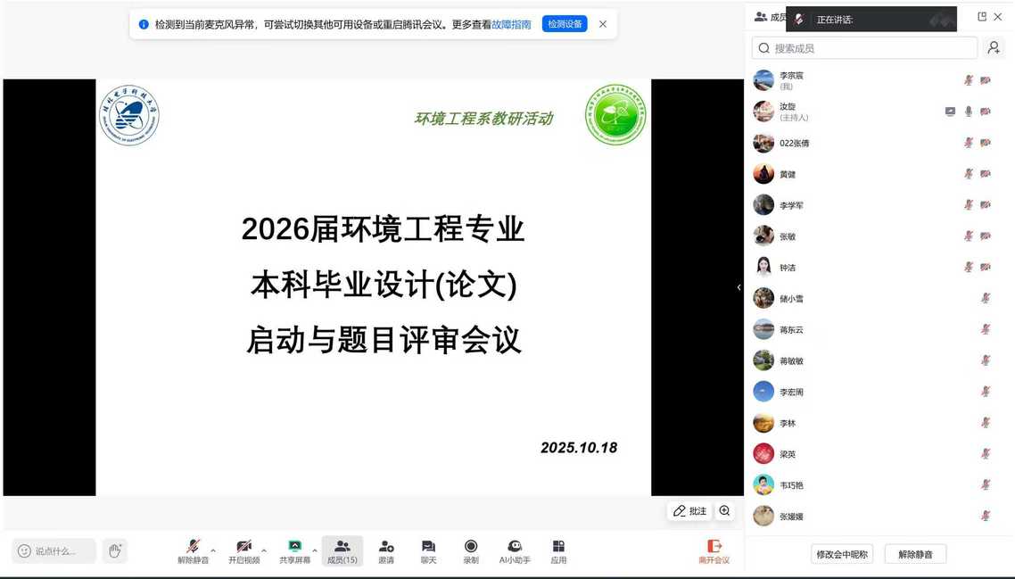 为规范毕业设计(论文)管理,保障选题质量,10月18日晚,环境工程系组织召开2026届本科毕业设计(论文)题目评审启动会。会议由环境工程系副主任汝旋老师主持,全体环境工程系教师参加。