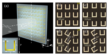 图1(a)超表面结构示意图;(b)-(e)超表面显微镜实物图