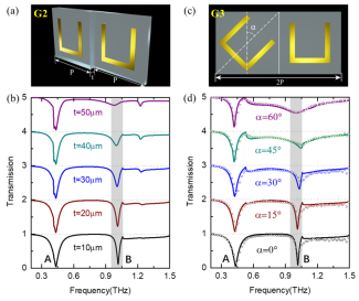 图3通过(a)改变衬底厚度和(c)旋转U形结构引入相邻单元的相位差;(b,d)对应结构的透射谱