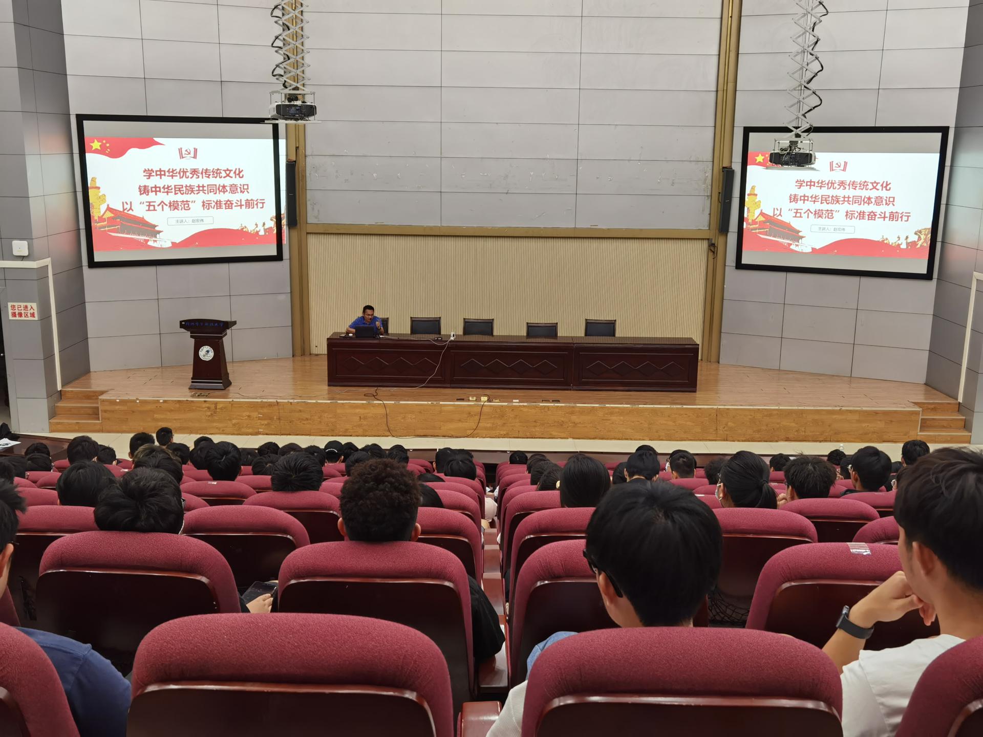 5月18日晚,光电工程学院特邀学校统战部副部长赵宏伟以“学中华优秀传统文化,铸牢中华民族共同体意识,以‘五个模范’标准奋斗前行”为题开展中华优秀传统文化专题讲座。讲座在科技楼报告厅举办,光电工程学院全体2021级本科生参加了讲座。