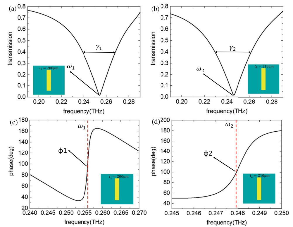 图2全波模拟:(a)单独左结构的透射谱,(b)单独右结构的透射谱,(c)单独左结构的相位,(d)单独右结构的相位。右侧图为仿真结果(黑线)与理论计算结果(红线)。