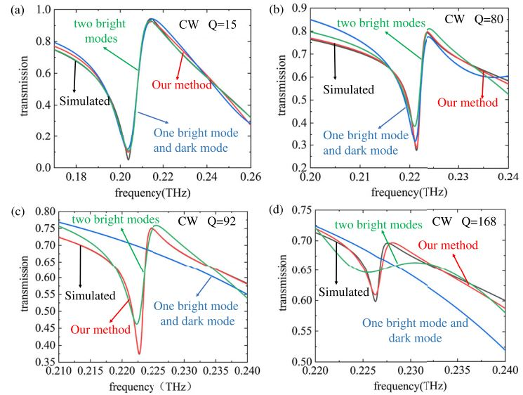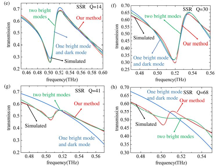 图4黑线、蓝线、绿线和红线分别展示了全波模拟、之前理论计算结果、没有相位信息的两个明模计算结果以及本文理论的结果。(a)、(b)、(c)和(d) / (e)、(f)、(g)和(h)分别代表了金属棒/分裂环BIC的低Q、中Q、高Q和非常高Q的情况(见图1)。