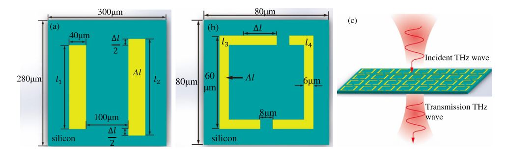 图1 (a)切割线(CWs) BIC的结构;(B)分裂环谐振器(SRRs)的结构;(c)输入太赫兹波和超表面透射谱示意图。