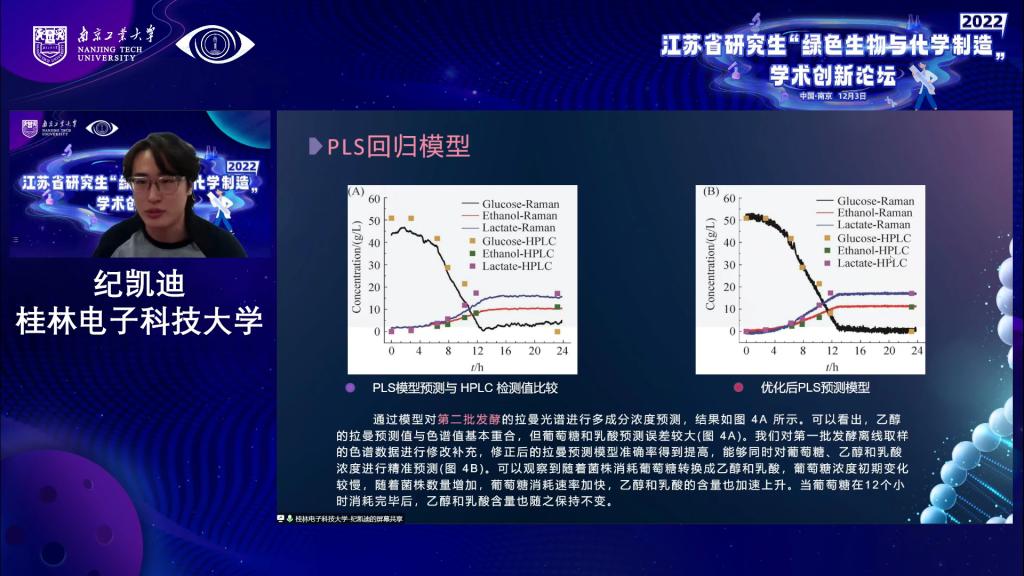 纪凯迪同学汇报的相关工作是生物光子团队与湖北大学生命科学学院杨世辉教授的合作成果,项目将团队开发的拉曼分析仪跨学科地应用在发酵过程中能量和营养物质及产物的实时过程在线分析,打开生物过程的黑盒子,有着广泛的工业应用前景。该工作发表在2022年11月的《微生物学报》期刊上,由国家重点研发计划“绿色生物制造”专项支持。纪凯迪同学作为并列第一作者,主要承担整个拉曼实时过程预测的数据分析工作。
