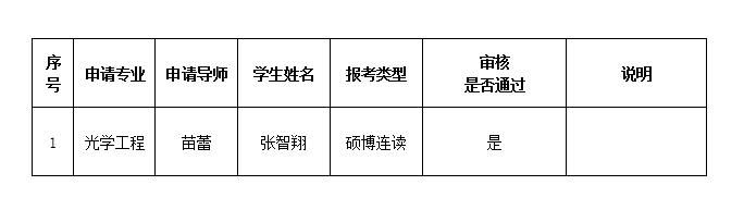 根据《2023年博士研究生招生简章》要求,经本人申请、学院审核,共收到1名申请硕博连读人员材料;其中,通过资格初审人员1名,不通过资格初审人员0名;通过资格初审的人员可直接入围复试环节。现将资格审查结果予以公示,公示期至2022年12月23日(三个工作日)。