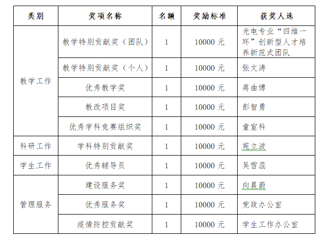 根据《关于开展光电工程学院2022年度 企业奖教金评选推荐工作的通知》等相关工作安排,经过教职工个人申请,学院党政联席会讨论评审,确定各奖项获奖人选。现将蒋曲博等获奖教职工进行公示。