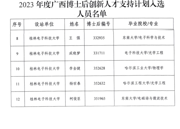 近日,自治区人力资源社会保障厅公布了2023年度广西博士后创新人才支持计划入选结果,全区共有22名博士后入选该计划。我院青年博士王强、成晓梦、柯俊臣(仪器科学与技术博士后流动站,合作导师:韩家广),李金健(机械工程博士后流动站,合作导师:曲士良)、杨世泰(机械工程博士后流动站,合作导师:苑立波)等5名博士申报并全部获批,支助率为100%。至今,学校累计获自治区博士后创新人才支持计划已达14人。