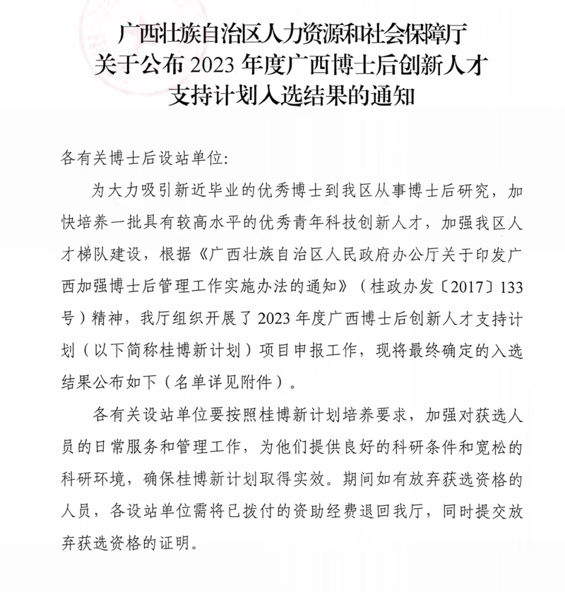 广西博士后创新人才支持计划每年遴选一次,旨在大力吸引区外高校的优秀博士毕业生到广西从事博士后研究,聚焦重大战略、重大产业、战略性新兴产业及高校“双一流”建设,培育一批具有较高水平的优秀青年科技创新人才。