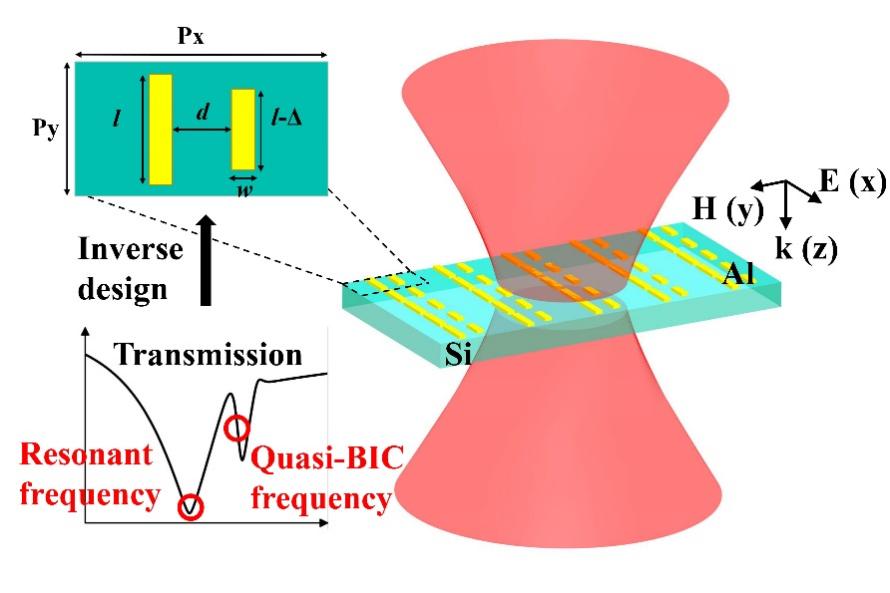 近年来,超材料中的连续体束缚态(BIC)因其可以最大限度地减少因相消干涉而导致的超材料辐射损失以及超材料BIC器件在透射或反射光谱中高Q的谐振,使其在太赫兹(THz)功能器件和传感领域得到了广泛的应用。其中准BIC的逆向设计是一个重要的研究方向,目的是基于从透射谱中提取的信息来设计超材料结构。然而,由于准BIC的强耦合性和极高的非线性,超材料结构的几何参数与透射谱之间的关系并不清晰,这给逆向设计带来了巨大的困难。传统的逆向设计方法主要依赖于来自经验的广泛参数扫描,且忽视了结构之间的相互作用。最近机器学习在超材料逆向设计方面也取得了重大进展,这种方式具有传统设计所缺乏的灵活性。然而值得强调的是,深度学习或机器学习方法需要大量扫描超材料几何参数的训练数据库,并且其最大问题是将逆向设计视为隐藏物理过程的黑盒问题,不利于我们对于准BIC物理含义的理解。最重要的是,当我们改变超材料的结构时,机器学习技术需要对新的训练数据进行重新训练,换句话说机器学习方法并不普遍适用。