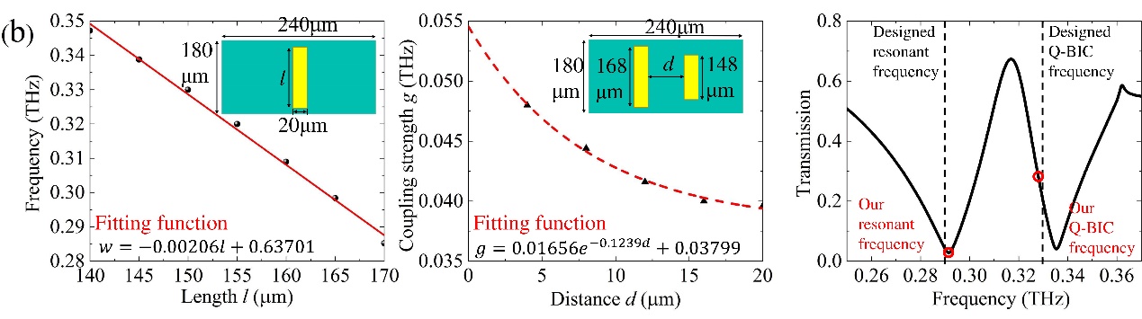 在本文中,我们首次通过将耦合模理论得到的透射谱减去惠更斯原理下无耦合情况的透射谱来获得准BIC峰的方程,并得出准BIC器件的谐振频率是由其基本结构决定的,而谐振频率与准BIC频率之间的频率差恰好等于其耦合强度的结论。基于这些理论计算,我们提出并通过实验验证了一种使用解析解的逆向设计方法,不需要对超材料的几何参数进行广泛的扫描,并且可以普遍应用于各种超材料结构。这为超表面准BIC器件的逆向设计提供了可行的新方案,其不仅有助于我们对超表面耦合机理的深入认识,而且有助于推动超材料BIC器件在太赫兹功能器件和传感等领域的应用。