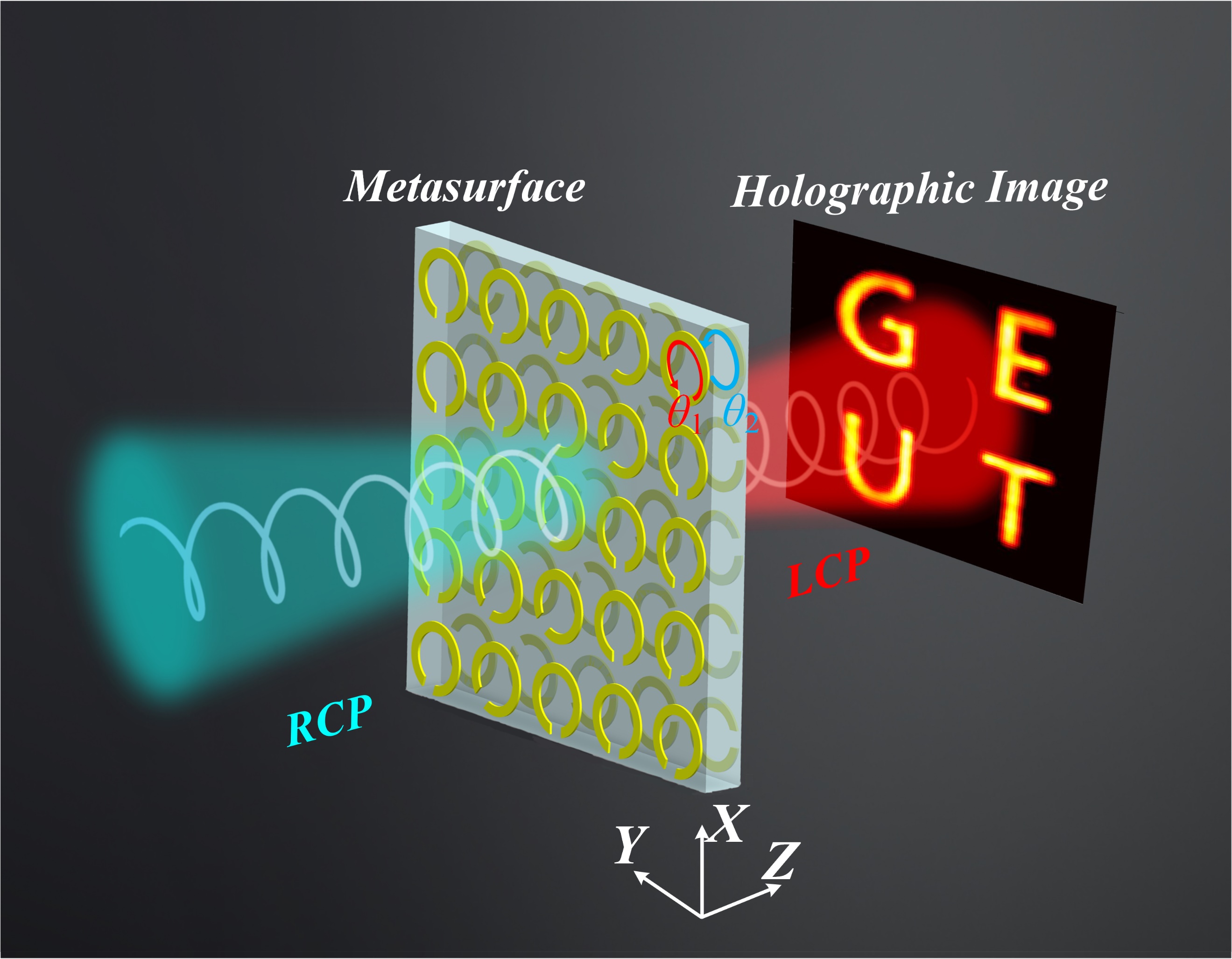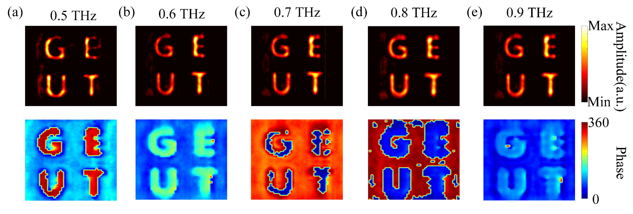 为验证这一设计概念,研究团队制作了一个全息超表面,并通过实验展示了其对THz波前的操控能力。该全息超表面在0.6 THz的频率下表现出色,成功实现了高质量的全息图像再现,验证了其在振幅和相位调制方面的有效性和卓越性能。