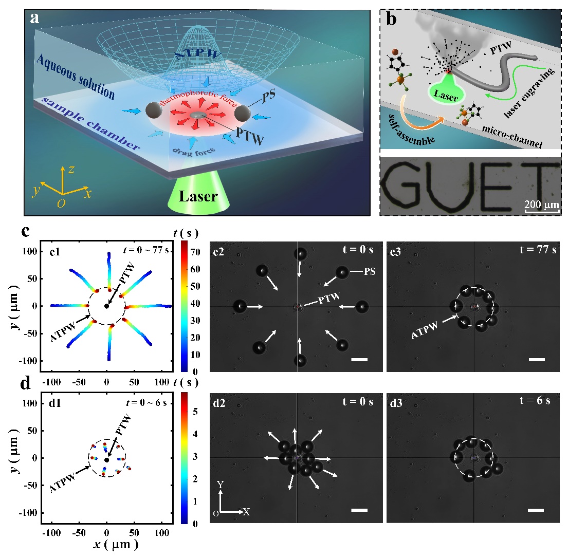 作者提出了一种基于新型激光诱导光热波导(PTW)自组装方法的TOT系统,该系统底部有各种图案的PTW,用于动态操纵微粒。当PTW吸收激光形成热点时,它诱导出一个非等温温度场,产生作用于粒子的热对流力和热泳力。在固定的激光下,最初位于不同位置的聚苯乙烯(PS)粒子表现出两种典型的动态迁移:向内和向外。然而,无论它们的初始位置如何,粒子最终都会被捕获在相同的环形捕获势阱(ATPW)区域。这一观察结果明显不同于光制冷镊系统。作者进一步提出了一个物理模型来定量研究颗粒迁移机制。结果表明,来自不同初始位置的粒子均朝捕获势阱中心汇聚,符合TOT系统的操纵机制。