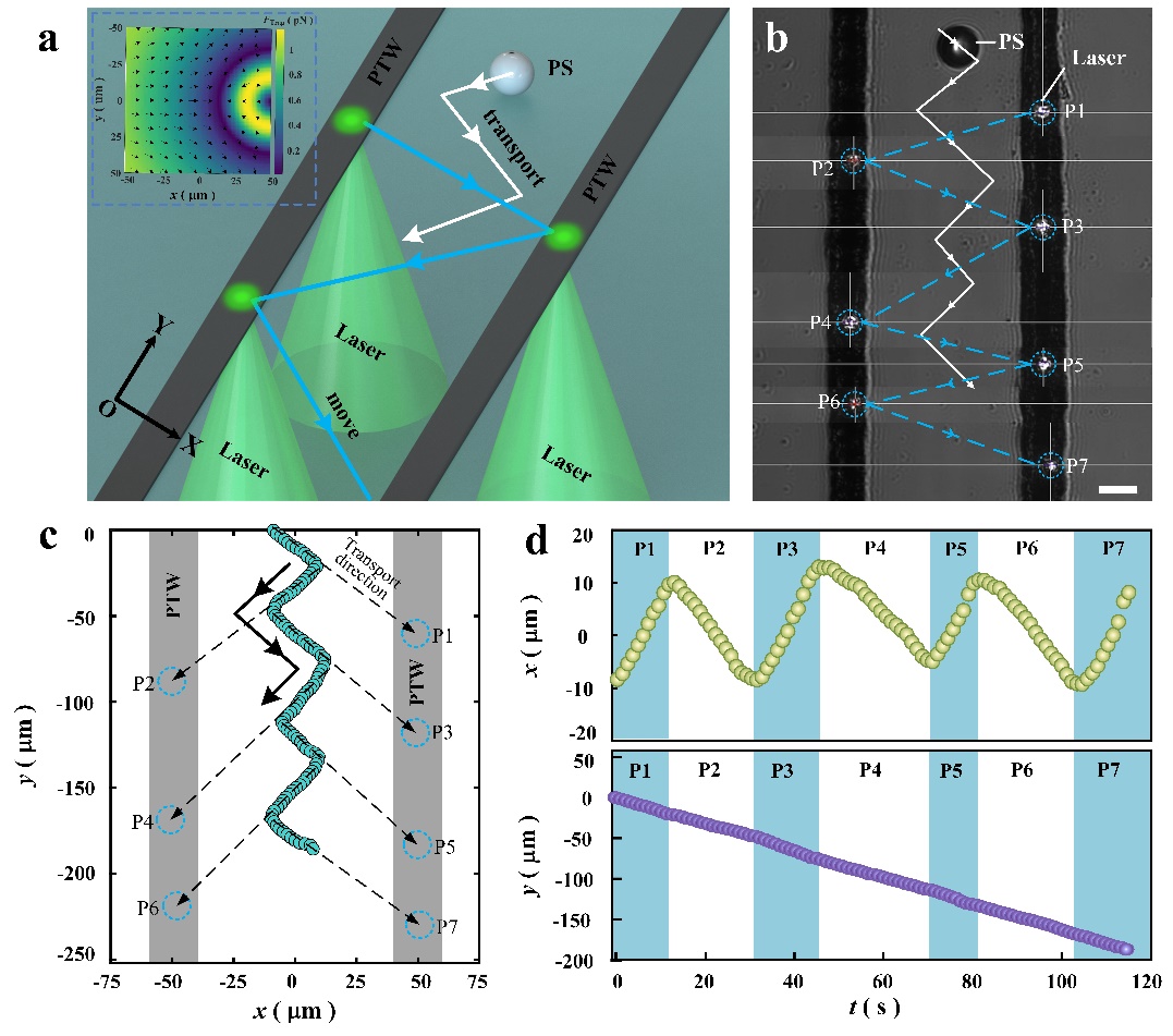 作者提出了一种基于新型激光诱导光热波导自组装方法的热光镊系统,当光热波导吸收激光,在其周围液体环境中诱导出非等温温度场,并产生作用于粒子的热对流和热泳力,它们可实现对位于不同位置的PS粒子的两种典型的动态迁移能力:向内汇聚和向外扩散,最终粒子会被捕获在环形势阱区域。利用了不同类型的光热波导和激光加载模式,实现了对单个粒子的三种操纵方式:z形迁移、粒子振荡和定向输运。此外,该技术可以以非接触方式精确捕获光热波导附近具有负折射率和不规则形状的粒子。因此,作者的工作为非接触粒子精准操纵提供了可行的新方法,为细胞和生物分子的光热控制开辟了新的途径。