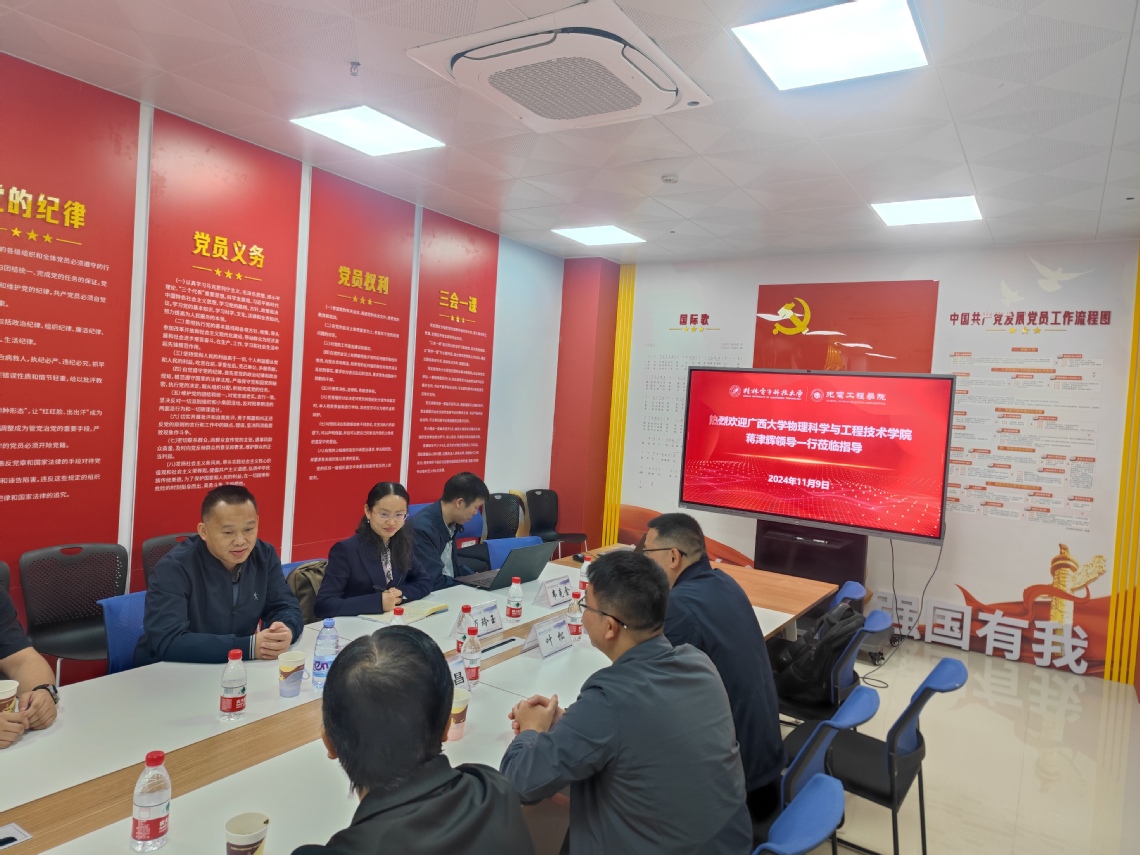 11月9日,广西大学物理科学与工程技术学院的副书记蒋津辉、副院长万玲玉、院长助理韦克金等一行到我院进行调研交流。我院副院长叶松、副院长邓洪昌等参与了此次交流。双方围绕学科与专业建设、科研平台建设、研究生培养以及人才引进与培育等方面进行了深入探讨,并达成了建立常态化交流与合作的意向。这次交流为双方未来的合作奠定了良好的基础。