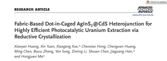 近日,我院联合上海大学在AgInS2@CdS异质结光催化还原晶化促进海水提铀机制与应用研究方面取得新的进展。研究成果以“Fabric-Based Dot-in-Caged AgInS2@CdS Heterojunction for Highly Efficient Photocatalytic Uranium Extraction via Reductive Crystallization”为题发表于材料类Top期刊《Advanced Functional Materials》(影响因子19,中科院分区1区),文章DOI: 10.1002/adfm.202513087。光电工程学院博士研究生黄小艳为第一作者,光电工程学院薛小刚副研究员、韩家广教授以及上海大学马红娟教授为共同通讯作者,三亿官方官网三亿(中国)_三亿(中国)为论文的第一完成单位。