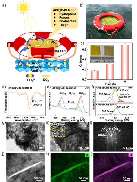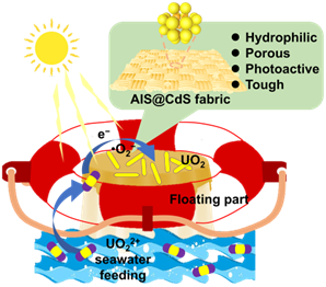 缓解当前铀资源短缺、应对未来陆地铀资源耗尽、解决放射性废水排放带来的环境挑战、确保核电的可持续发展,迫切需要高效从水溶液中(包括海水、卤水以及采矿和核电站产生的放射性废水)提取铀的铀回收技术。光催化铀提取已成为从核废水和海水中回收铀的一种有前景的策略,设计具有高还原效率和有效铀富集能力的光催化剂是其中的关键。研究团队提出了一种新的铀提取策略,将光催化还原与组装促进的结晶相结合,利用Cd-ZIF-8衍生的AIS@CdS “点笼”核壳结构负载的织物,该复合光催化提铀组件可以在弱自然光下运行,实现无牺牲剂条件下的高效海水提铀,并克服了在海洋环境中回收粉末状催化剂的问题。“点笼”核壳结构4AIS@CdS在可见光下实现了99.3%的显著铀去除效率,最高量子效率达32.0%,且无需外加空穴牺牲剂,其反应速率分别比纯CdS和纯AIS高出2.1倍和37.3倍。能带分析表明,AIS和CdS之间的异质结促进了光生载流子的分离/转移和电子在AIS一侧的累积,而点笼结构为U(VI)的还原结晶提供了合适的热力学环境,导致具有与AIS共形针状UO₂晶体的形成。4AIS@CdS织物在海洋环境,自然阳光照15小时后达到了1.05 mg g⁻¹的铀提取容量。该成果不仅为在弱光条件下从水溶液中高效回收铀提供了一条新途径,还突显了基于织物的光催化系统在可扩展和可持续铀提取方面的潜力,为光催化海水提铀材料体系的设计提供了新的思路。