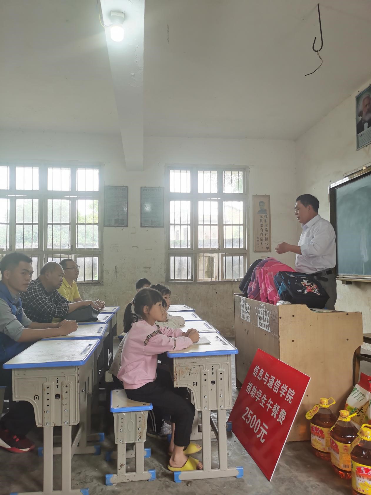 5月18日,信息与通信学院党委书记仇洪冰一行赴全州县枧塘镇金屏村开展乡村振兴工作。在金屏村村委,仇洪冰一行慰问了驻村第一书记,并带领学院通信工程系教工党支部与第一书记到金屏小学召开座谈交流会并进行捐赠仪式和心理行为训练。座谈会上,仇洪冰书记代表学院通信工程系教工党支部向屏山小学师生表达了慰问,针对现阶段屏山小学建筑年久失修问题给予了帮助与支持。为学校师生送去日常生活用品、书包、文具、保温杯、雨伞、雨衣、手电筒等慰问物资,捐助学生午餐费费用,给予学校师生生活上的关怀。