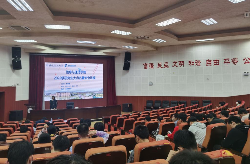 为进一步提升学院研究生安全意识,提高安全防范能力, 3月21日下午,信息与通信学院在金鸡岭校区三教报告厅召开2022级研究生大点名,并开展安全专题教育。学院研究生辅导员彭致璇、2022级全体研究生参加了会议。