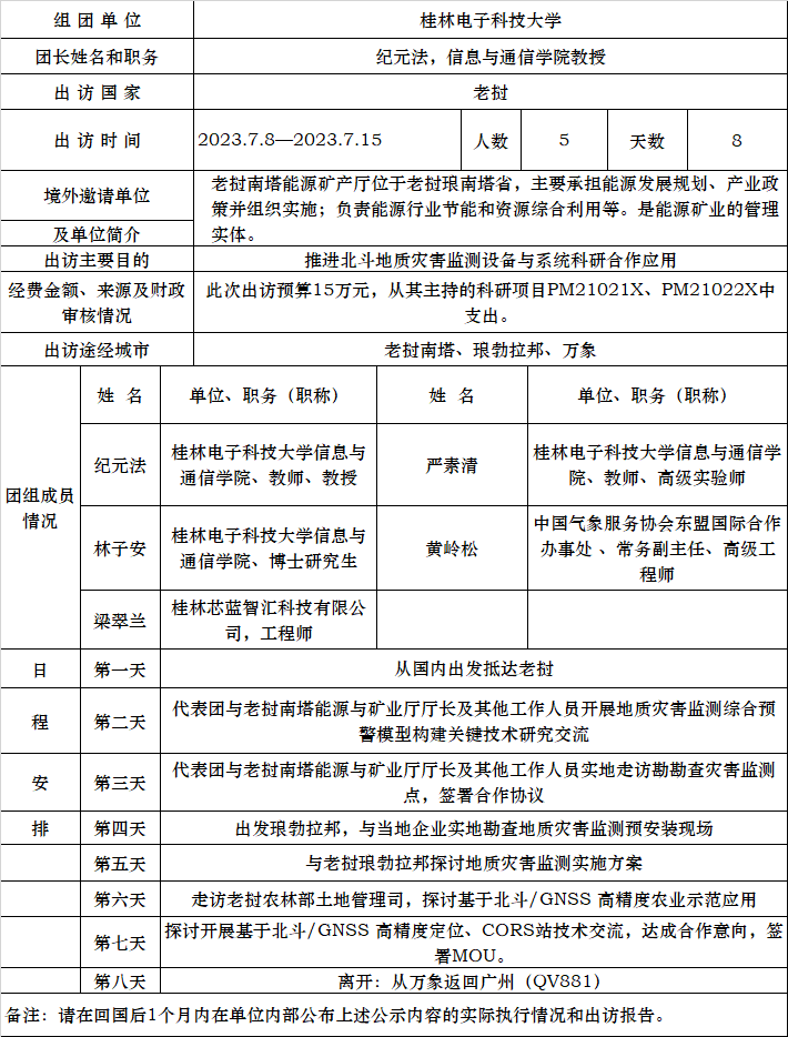 应老挝南塔能源和矿业厅邀请,为推进北斗/GNSS高精度定位科研合作,经研究,我单位拟派纪元法、严素清、和林子安等5位同志于2023年7月8日至7月15日赴老挝。
