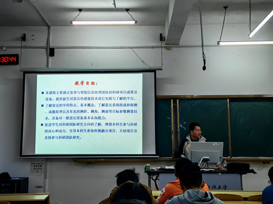《雷达传感器技》由宽带与智能信息研究中心廖可非、王海涛、谢宁波、陈汉波、李沁璘及蒋艳英老师承担。该课程主要通过宽带与智能信息处理团队的科研项目成果及设备,提供新生对雷达传感器技术进行实践与了解的平台,了解雷达的学科特点、基本概念,了解雷达系统组成和探测、成像原理以及常见的测距、测角、测速等目标参数测量技术,对一般雷达设备产生基本认知,促进学生对科研团队研究方向的了解,增强本科生参与科研的决心和动力,引导本科生参加科教融合项目、大创项目及直接参与科研团队研究。