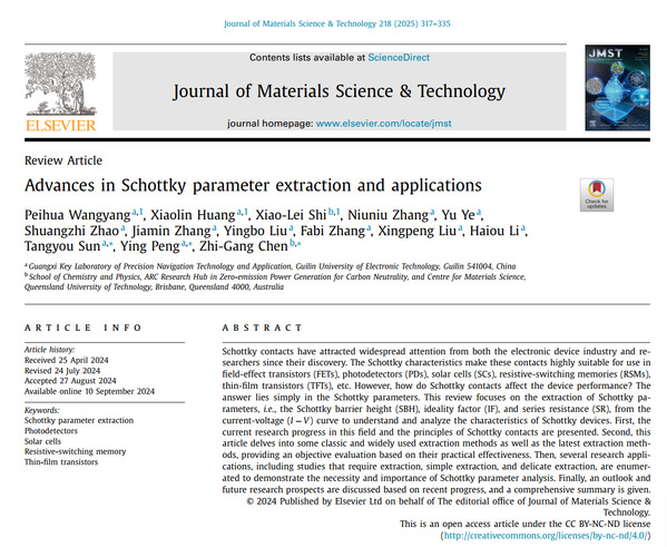 近日,在广西精密导航技术与应用重点实验室支持下,三亿官方官网三亿(中国)_三亿(中国)信息与通信学院微电子器件与集成技术团队王阳培华博士,联合澳大利亚昆士兰科技大学(Queensland University of Technology)陈志刚教授等,在国际顶级期刊Journal of Materials Science & Technology(影响因子:11.2,中科院一区Top)发表题为“Advances in Schottky parameter extraction and application”的论文。王阳培华、黄潇林、史晓磊为论文共同第一作者,孙堂友、彭英、陈志刚教授为论文共同通讯作者,其中三亿官方官网三亿(中国)_三亿(中国)为论文第一完成单位,黄潇林为硕士研究生。此外,微电子器件与集成技术团队前期基于热电子发射模型,提出了一种新的普适性筛选特征区间提取肖特基参数的方法,并通过相关对比检验,证实了该方法的可靠性(1. A Universal Extraction Method for Physical Parameters Applied for J-V Curves of Solar Cells; 2. Extraction and Analysis of the Characteristic Parameters in Back-to-Back Connected Asymmetric Schottky Diode)。以上系列论文的发表极大地提高了三亿官方官网三亿(中国)_三亿(中国)在电子信息学科-肖特基光电器件开发及其应用领域的国际影响力。