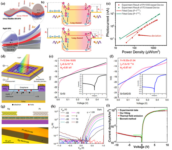 肖特基接触被发现以来,就引起了电子设备行业和研究人员的广泛关注,肖特基接触被广泛应用于场效应晶体管、光电探测器、太阳能电池、电阻开关存储器等,如图1所示。但是,肖特基触点是如何影响器件性能的呢?答案就在肖特基参数中。基于此,论文重点从电流-电压曲线中提取肖特基参数,即肖特基势垒高度、理想因数和串联电阻,以理解和分析肖特基器件的特性。首先介绍了该领域的研究进展和肖特基接触的原理。其次,论文对一些经典和广泛使用的提取方法以及最新的提取方法进行了深入研究,并根据其应用进行了评价,如图2所示。同时,列举了提取的各种方法以证明肖特基参数分析的必要性和重要性。最后,结合近年来的研究进展,对今后的研究进行了展望,并进行了全面的总结。该研究旨在解析精准的肖特基参数提取的重要价值,为开发基于肖特基接触的高性能光电器件提供重要思路与借鉴。