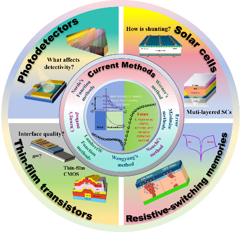 肖特基接触被发现以来,就引起了电子设备行业和研究人员的广泛关注,肖特基接触被广泛应用于场效应晶体管、光电探测器、太阳能电池、电阻开关存储器等,如图1所示。但是,肖特基触点是如何影响器件性能的呢?答案就在肖特基参数中。基于此,论文重点从电流-电压曲线中提取肖特基参数,即肖特基势垒高度、理想因数和串联电阻,以理解和分析肖特基器件的特性。首先介绍了该领域的研究进展和肖特基接触的原理。其次,论文对一些经典和广泛使用的提取方法以及最新的提取方法进行了深入研究,并根据其应用进行了评价,如图2所示。同时,列举了提取的各种方法以证明肖特基参数分析的必要性和重要性。最后,结合近年来的研究进展,对今后的研究进行了展望,并进行了全面的总结。该研究旨在解析精准的肖特基参数提取的重要价值,为开发基于肖特基接触的高性能光电器件提供重要思路与借鉴。