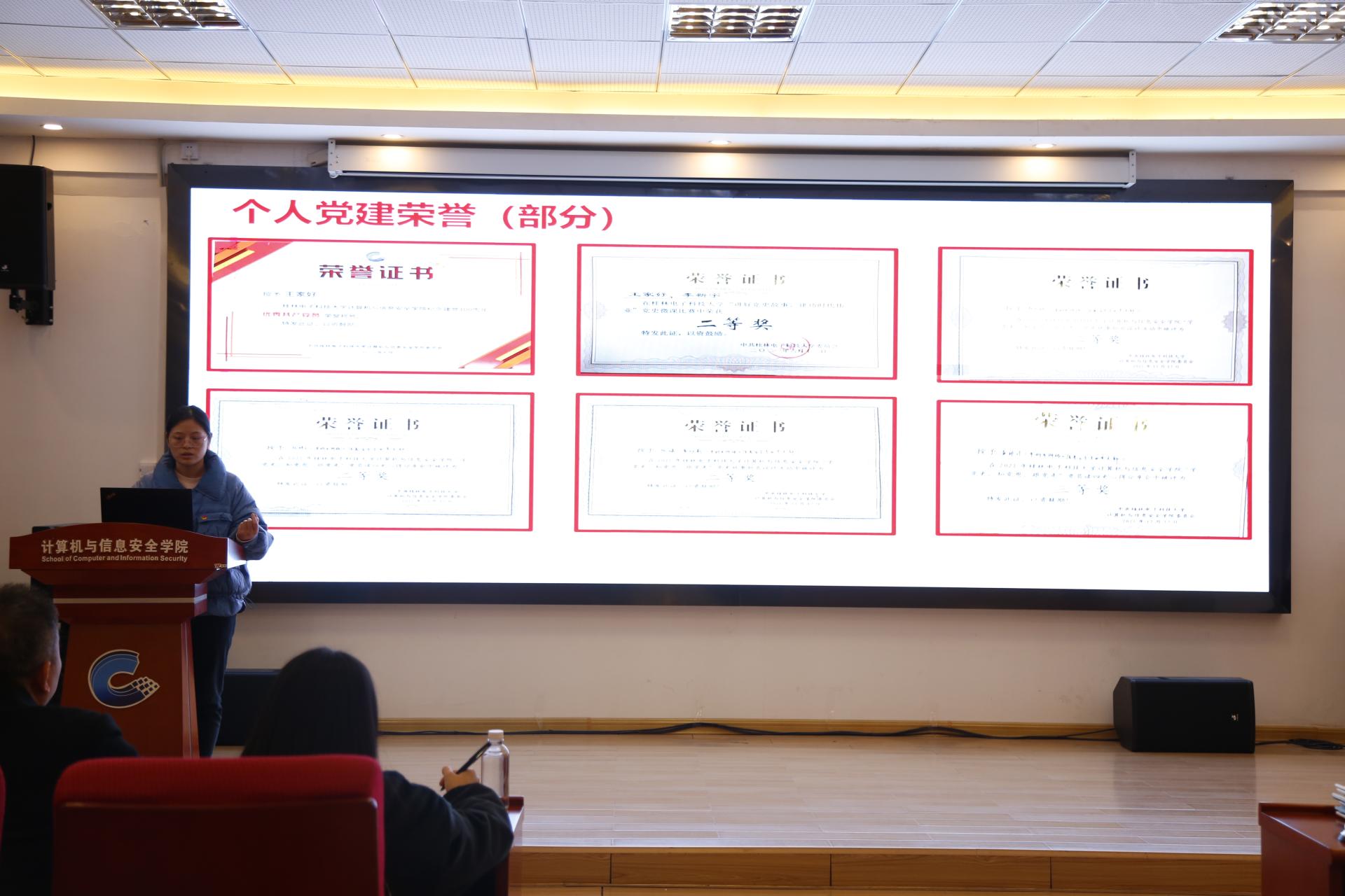 会上,我院党委各支部书记围绕本支部一年工作成效、工作不足以及今后工作思路三个方面开展工作述职。述职结束,学院党委书记文辉总结指出,各支部要加强党支部的建设,严格规范组织生活,落实“三会一课”制度,加强党员教育管理,发挥师生党员先锋模范作用。最后,综合各支部日常落实“三会一课”以及支部书记述职情况,本科生计算机科学与技术专业第一党支部、本科生计算机科学与技术专业第二党支部、本科生网络与信息安全专业党支部、本科生软件工程专业党支部、研究生软件工程专业党支部、研究生网络空间安全专业第一党支部被评为优秀党支部。